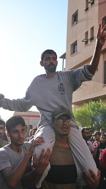 Crowds of Palestinians gathered in front of Nasser Hospital in the city of Khan Yunis, to receive nearly 2,000 prisoners and detainees released from Israeli prisons, today, Monday. One aid coordinator says the question now is whether Palestinians are free to leave Gaza safely.